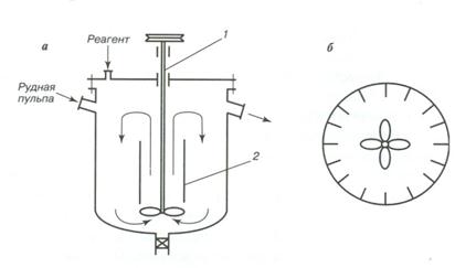 Горизонтальные многосекционные (а) и вертикальный (б) автоклавы с механическим перемешиванием пульпы, работающие под повышенным давлением кислорода или воздуха: