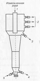 Мелкораздробленный материал поступает в среднюю часть колонны, а выщелачивающий раствор - в нижнюю ее часть со скоростью, близкой к скорости перехода неподвижного слоя дисперсного материала во взвешенное состояние. Рабочая скорость раствора подбирается так, чтобы в средней конической части колонны происходила классификация твердых частиц - крупные фракции осаждались вниз, а иловые фракции поднимались вверх. Высоты конической и нижней цилиндрической частей колонны должны обеспечить время пребывания песковых фракций в колонне, достаточное для достижения заданной степени извлечения ценных компонентов. В верхней цилиндрической части колонны скорость раствора падает и захваченные раствором частицы твердой фазы осаждаются вниз. Осветленный раствор выводится из верхнего цилиндра, илы - между основной конической частью аппарата и верхним цилиндром, пески - внизу колонны. Такой аппарат предназначен для быстротекущих процессов. Организовать идеальный режим работы этой колонны трудно, и широкого распространения такие аппараты не получили. Для перемешивания можно использовать пульсации. В пульсационном аппарате для выщелачивания пульсации создаются при подаче сжатого воздуха из ресивера в генератор импульсов. Пульсации воздуха передаются в пульсационную камеру, а из нее в пульсационное перемешивающее устройство.