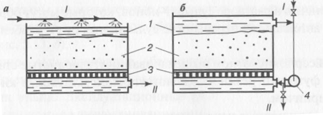 Схема аппаратов с пневматическим перемешиванием (типа пачуков) с циркулятором (а) и со свободным и транспортным эрлифтами (б):