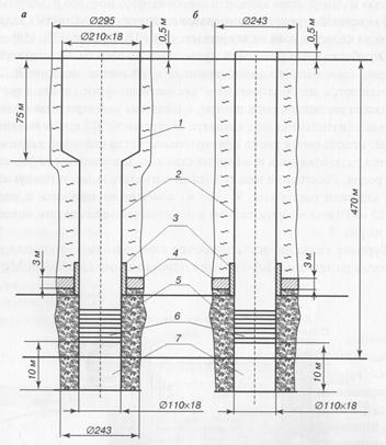 Отработка месторождений проводится по блокам. Существует несколько схем расположения закачных и откачных скважин. В США применяются шестиугольные и квадратные сетки, когда откачная скважина располагается в центре, а закачные - в вершинах правильного шестиугольника или квадрата. В странах СНГ, кроме указанных выше, используется также прямоугольная сетка скважин, когда чередуются ряды откачных и закачных скважин, проходящих параллельно оси ролла. Расстояние между рядами нагнетательных и продукционных скважин составляет 50—100 м, а между скважинами в ряду - 15-25 м. Разрез нагнетательной и продукционной скважин представлен на рисунке.