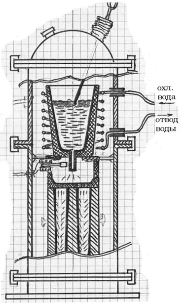 Способы рафинирования урана Все примеси, сопутствующие урану, обычно удаляют на предварительных стадиях обработки солей перед восстановлением. Однако в черновом слитке урана обычно содержится (в среднем): · до 0,4 % шлака восстановительной плавки · до 0,01 % азота · до 0,05 % углерода · до 0,01 % кислорода · до 8-10 мл водорода на 100 г урана · от 0,0001 до 0,001 % металлов. Рафинирование чернового металла необходимо для: · Наиболее полного удаления CaF2 и др. «шлаков». · Дегазации металла – удаления O, N, H. · Удаления (снижения концентрации) углерода. · Удаления остатков металла-восстановителя (например, Са). · Удаление металлических загрязнений. · Удаления «пустот» (раковин и пор) в металле. В качестве методов рафинирования урана наибольшее распространение получили индукционно-вакуумный переплав, электролиз в солевых расплавах, зонная перекристаллизация. В данном методе используется индукционный способ нагрева. Вакуум в рабочем пространстве печи создаётся в две стадии: 1-я стадия - 0,2-0,3 мм рт.ст. 2-я стадия - 10-2 мм рт.ст. (т.е. 1-2 Па). Для оценки возможности и эффективности рафинирования чернового урана необходимо знать в каком виде загрязнения присутствуют в металле: шлак – CaF2 присутствует в виде дисперсионного и по границам зёрен металла; кальций (металл-восстановитель) – сопутствует шлаковым включениям по границам зёрен. Следует учесть, что могут образовываться субфториды, т.е. вместо CaF2 появится частично CaF2-CaF; углерод, кислород и азот образуют карбиды, оксиды, нитриды, точнее оксикарбонитриды; водород – растворён в металле; металлы-загрязнители – образуют сплавы с низкой концентрацией. Индукционно-вакуумный переплав и индукционные печи обладают рядом преимуществ по сравнению с другими методами: · тепло развивается в самом тигле (графит), что обеспечивает высокий термический коэффициент полезного действия печи · черновой слиток может быть нагрет с предельной необходимой скоростью · температура нагрева плавки не ограничена · конструкция печи проста и внутри вакуумного пространства отсутствует арматура нагревателя Печи со сливом из донной части нашли более широкое применение, нежели опрокидывающиеся, поскольку в данном случае металл, содержащий шлаковые примеси (обладающие более низкой плотностью и концентрирующиеся в верхней части жидкого металла) сливается в форму в последнюю очередь. Основная масса отливки получается чистой от шлаков. Уран отливают в графитовые изложницы. Изложницы, подобно тиглю, обмазаны плавленой окисью магния для увеличения срока службы и получения болванок с хорошей поверхностью. Схема конструкции индукционной печи, работающей при частоте f = 2500-4000 Гц с донным разливом металла.