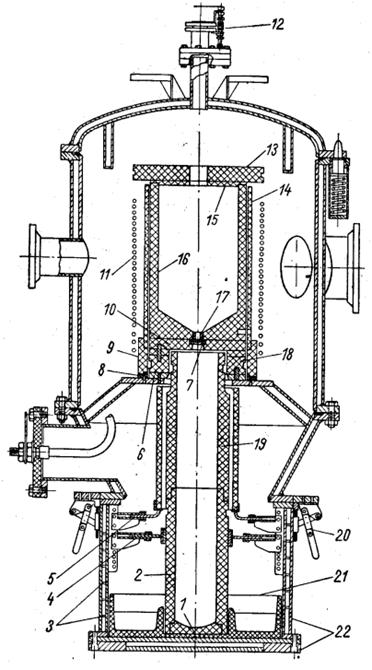 Схема устройства вакуумной индукционной печи для плавления урана: 1 – основание изложницы, 2 – нижняя часть изложницы, 3 – экраны, 4 – держатель изложницы, 5 – держатель огнеупорного экрана, 6 – кольцевое основание для тигля, 7 – ползун для поднятия пробки, 8 – кольцо для поддержки муфты из двуокиси циркония, 9 – внутренняя изоляционная муфта, 10 – опора тигля, 11 – индуктор, 12 – смотровое окно, 13 – верхняя изоляционная крышка, 14 – муфта, 15 – крышка тигля, 16 – тигель, 17 – пробка, 18 – изоляционное основание, 19 – верхняя часть изложницы, 20 – рычажное соединение, 21 – донная футеровка, 22 – рубашка изложницы.