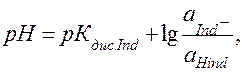 Из уравнения (43) следует, что изменение рН приводит к изменению соотношения основной и кислотной форм индикатора, а следовательно и к изменению цвета. Интервал, в котором глаз воспринимает переходный цвет, называется интервалом перехода индикатора. Он находится в границах рН: рН = рКдис.HInd