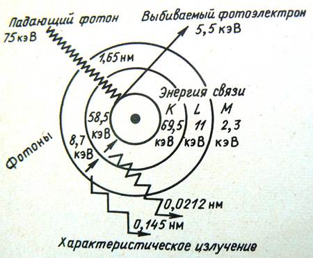 Известны три типа взаимодействия рентгеновского и гамма излучений с веществом: фотоэлектрический эффект, комптоновское рассеяние и образование пар. Фотоэлектрический эффект – основной вид поглощения фотонов низкой энергии (< 25 кэВ). Этот процесс сходен с процессом образования характеристических рентгеновских лучей. При этих переходах выполняется закон сохранения энергии. Ниже этот процесс изображен для вольфрама.