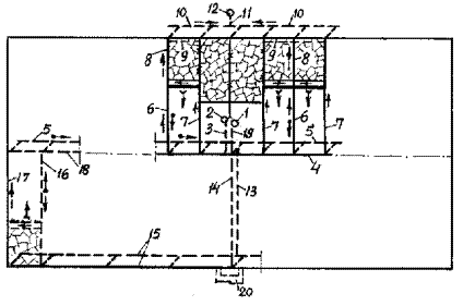 Рис.4.7. Погоризонтный способ подготовки шахтного поля: 1, 2 — ствол соответственно главный и вспомогательный; 3 — капитальный транспортный квершлаг; 4, 5 — главный (магистральный) транспортный штрек соответственно пластовый и полевой; 6 — выемочный бремсберг; 7 — воздухоподающий ходок; 8 — вентиляционный ходок; 9 — разрезной просек; 10 — главный полевой вентиляционный штрек; 11 — вентиляционный квершлаг; 12 вентиляционный ствол; 13 — центральный уклон; 14 — ходок центрального уклона; 15 — главный дренажный штрек полевой и пластовый; 16 — выемочный уклон; 17 — вентиляционный ходок; 18 — главный вентиляционный штрек для проветривания уклонного поля; 19 ‑ главный вентиляционный квершлаг