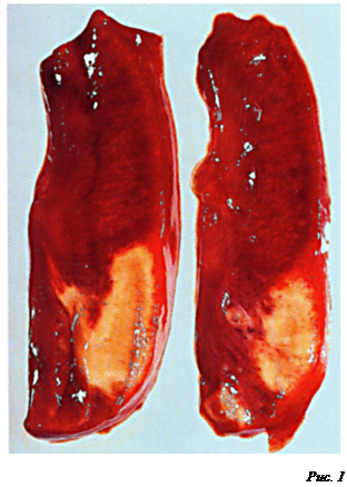 • Для бородавчатых эндокардитов характерно: фибриноидные изменения с повреждением эндотелия клапанов и появлением по краю клапанов (чаще на предсердной поверхности створок) нежных тромботических наложений в виде бородавок, что часто осложняется тромбоэмболиями сосудов большого круга кровообращения с развитием абсцессов в различных органах (рис. 8 и 9)