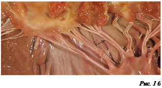 • В исходе клапанного эндокардита развивается ревматический порок сердца, морфологическим выражением которого являются утолщение, склероз, гиалиноз и петрификация створок клапанов, а также утолщение и укорочение хордальных нитей (как исход хордального эндокардита). • Ревматический порок может быть представлен либо стенозом, либо недостаточностью клапанов (рис. 10 а,б,в)). Он может быть комбинированным (комбинация этих видов порока в одном клапане) или сочетанным, чаще митрально-аортальным.