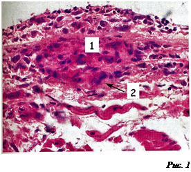 • Порок сердца сопровождается гипертрофией тех или иных отделов сердца, что в конце концов приводит к декомпенсации и развитию острой или хронической сердечно-сосудистой недостаточности. 2. Миокардит. • Может быть продуктивным гранулематозным (чаще у взрослых), межуточным экссудативным диффузным (чаще у детей) или очаговым. • Для продуктивного гранулематозного (узелкового) миокардита характерно образование гранулем Ашоффа -Талалаева в периваскулярной соединительной ткани (рис. 11): в центре гранулемы – очаг фибриноидного некроза, по периферии крупные гистиоциты (макрофаги) – клетки Аничкова.