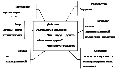 Когда разработан стратегический план перед менеджером стоит задача превратить его в действия и хорошие результаты. Если разработка стратегии – это прежде всего предпринимательская деятельность, то ее реализация – внутренняя административная деятельность. Детали такой деятельности зависят от конкретной ситуации. При этом следует отметить повторяющиеся ключевые задачи этого процесса (рис. 4). Каждая из ключевых задач подразделяется на ряд подзадач. 1. Построение организации, способной осуществить стратегию, должно включать разработку внутренней организационной структуры, исходя из нужд стратегии; создание искусств и отличительных преимуществ, на которых базируется стратегия; выбор людей на ключевые позиции. 2. Стиль стратегического руководства требует управления процессом роста показателей, культуры фирмы и содействия стратегии; поддержки организационных инноваций и новых возможностей; участия в политике реализации стратегии, поддержке производственных возможностей и организационного консенсуса; соблюдения этических стандартов в поведении; инициативы корректирующих действий для улучшения методов реализации стратегии. 3. Развитие корпоративной культуры применительно к стратегии включает: установление частных показателей; определение этических стандартов; создание рабочей обстановки поддержки стратегии, воспитание работников на высоком культурном уровне. 4. Разработка бюджета, обеспечивающего реализацию стратегии, предусматривает: наделение каждой организационной единицы бюджетом, обеспечивающим выполнение ее части стратегического плана; контроль за эффективным использованием ресурсов. 5. Создание внутренних административных обеспечивающих систем требует: определения и управления политиками и процедурами, влияющими на стратегию; разработки административных и оперативных систем для действия в стратегически критических ситуациях. 6. Разработка системы оплаты и поощрения должна включать: мотивацию организационных единиц и персонала в интересах реализации стратегии; разработку системы материального и морального поощрения; развития управления по результатам.