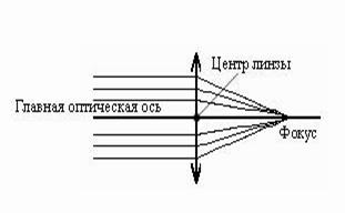 Рис. 11.12. Виды линз: двояковыпуклые (1); плосковыпуклые (2); двояковогнутые (3); плосковогнутые (4); выпукловогнутые (5); вогнутовыпуклые (6) Побочной оптической осью называют любую прямую, проходящую через оптический центр линзы и не совпадающую с главной оптической осью. В этом случае лучи, двигающиеся параллельно побочной оптической оси, собираются на фокальной плоскости линзы (рис.11.13б), а фокус расположен на пересечении побочной оптической оси с фокальной плоскостью.