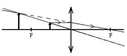а) б) Рис.11.13. Характеристики линзы: фокус (а), фокальная плоскость (б), главная и побочная оптическая оси, центр линзы. Правила построения изображения в линзах. Для построения изображения точки или отрезка в различных линзах используют правила, основанные на данных выше определениях: 1. Луч, проходящий через оптический центр линз, не изменяет своего направления. 2. Луч, идущий параллельно главной оптической оси, после преломления пройдет через фокус линзы. 3. Луч (или его продолжение), проходящий через фокус линзы, после преломления в ней выходит из линзы параллельно ее главной оптической оси. 4. Луч, движущийся параллельно побочной оптической оси собирается в точку, расположенную на фокальной плоскости. Рассмотрим примеры построения изображения в собирающей линзе. Пример 11.3. Объект расположен на расстоянии, большем, чем фокусное расстояние выпуклой линзы (рис.11.14а). Из верхней точки вектора слева от линзы выходят два луча. Один луч, не преломляясь, проходит через центр линзы. Необходимо отметить, что во всех случаях построения изображений в линзах, конец вектора источника света, его изображения и центра линзы лежат на одной прямой. Второй луч движется параллельно главной оптической оси, и, преломляясь в ней, проходит через главный фокус линзы. Справа от линзы два этих луча вновь пересекаются, образуя нижнюю точку перевернутого изображения исходного вектора. Луч из нижней точки вектора, движется через центр линзы, не преломляясь. Изображение вектора получается при опускании перпендикуляра на главную оптическую ось линзы. Пример 11.4. Объект расположен на расстоянии, меньшем, чем фокусное расстояние выпуклой линзы (рис.11.14б). В этом случае, как и в предыдущем примере, один луч из верхнего конца вектора движется параллельно главной оптической и, преломляясь в ней, проходит через главный фокус линзы. Второй не преломляясь, проходит центр линзы. За линзой лучи расходятся, а перед ней пересекаются при продолжении в обратную сторону лучей, проходящих через центр линзы и его главный фокус. В этом случае возникает мнимое увеличенное изображение предмета. Пример 11.5. Объект расположен на расстоянии, большем, чем фокусное расстояние вогнутой линзы (рис.11.14в). Построение в этом примере отличается тем, луч от верхнего конца вектора, движущийся параллельно главной оптической, после прохождения линзы отклоняется в другую сторону от главной оптической оси. Второй луч от верхней точки вектора проходит через центр линзы. На этом луче расположится и изображение верхнего конца вектора. Со вторым лучом пересекается продолжение этого луча. Изображение, как и в предыдущем примере, оказывается мнимым, но уменьшенным.