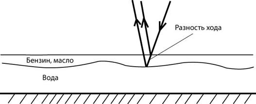 Рис. 11.21. Условия образование минимумов и максимумов интерференционной картины Примером интерференции является интерференция в тонких пленках. Хорошо известно, что если на воду капнуть бензина или масла, то будут заметны цветные разводы. Это обусловлено тем, что бензин или масло образует тонкую пленку на воде. Часть света отражается от верхней поверхности, а другая часть от нижней поверхности – границы раздела двух сред. Эти волны являются когерентными. Лучи, отраженные от верхней и нижней поверхности пленки (рис.11.22), интерферируют, образуя максимумы и минимумы. Таким образом, на тонкой пленке возникает интерференционная картина. Изменение толщины пленки бензина или масла на поверхности воды приводит к изменению разности хода для волн разной длины и, следовательно, изменению цвета полос.