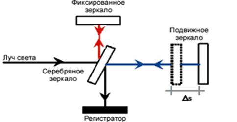 Рис. 11.22 Интерференция в тонких пленках Одно из важнейших достижений в использовании интерференции является создание сверхточного прибора для измерения расстояний – интерферометра Майкельсона (рис.11.24). Монохроматический свет падает на полупрозрачное зеркало, расположенное в центре рисунка, которое расщепляет пучок. Один пучок света отражается от неподвижного зеркала, расположенного вверху рис.11.23, второй от подвижного зеркала, расположенного на рис.11.23 справа. Оба пучка возвращаются в точку наблюдения, интерферируя между собой на регистраторе интерференции световых волн. Смещение подвижного зеркала на четверть волны приводит к замещению светлых полос на темные. Достигнутая в этом случае точность измерения расстояний составляет 10-4 мм. Это один из наиболее высокоточных методов измерения размеров микроскопических величин, который позволяет измерять расстояния с точностью, сравнимой длиной волны света. Настройка современных высокотехнологичных установок, например, элементов большого адронного коллайдера в ЦЕРНе происходит с точностью до длин волн света.