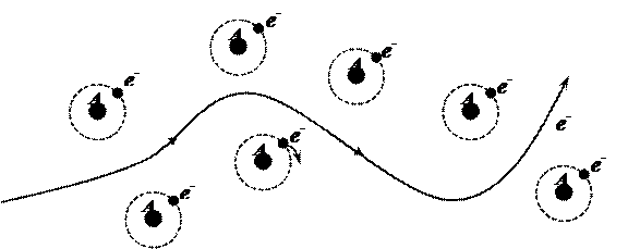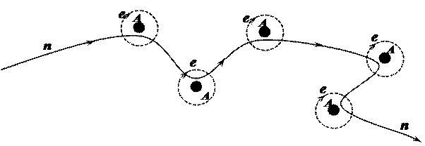 Рис. 16.4. Траектория движения электрона в среде. Пучки электронов широко используются как в науке, так и в различных отраслях народного хозяйства. В медицине они главным образом используются для получения рентгеновского излучения, тормозных фотонов высоких энергий и синхротронного излучения. В последние десятилетия пучки электронов активно используются в интраоперационной лучевой терапии. В этом случае опухоль в процессе операции или ложе опухоли сразу же после ее удаления облучается пучком электронов. Для электронов, в отличие от других частиц, при взаимодействии с веществом характерны существенные радиационные потери энергии. Как известно из электродинамики при движении заряженной частицы с ускорением они испускают фотоны. Ускорение, с которым тормозятся электроны в веществе, описывается вторым законом Ньютона: