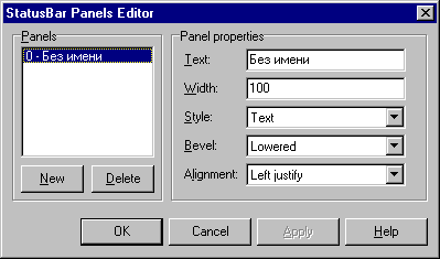 Рис. 8. Установка свойства Filter компонента OpenDialog1. Теперь можно взять в буфер обмена строку, образовавшуюся в колонке значений апротив свойства Filter, выбрать компонент SaveDialog1 и вставить содержимое буфера обмена в строку напротив свойства Filter. Этим самым мы установим такое же значение свойства Filter для второго диалога. При желании можно изменить заголовки диалоговых панелей (свойство Caption) и другие параметры (свойство Options). Обратите внимание на то, что языковая версия библиотеки может быть в общем случае как русской, так и английской, так как это ресурс Windows, а не вашего приложения. Поэтому, если вашим пользователям нужно, чтобы стандартные диалоги Windows были русскоязычными, рекомендуйте им установить русскую версию Windows 95 или Windows NT Workstation, либо попробуйте заменить на компьютерах пользователей имеющуюся версию comdlg32.dll на русскоязычную. Впрочем, на странице System имеется достаточное количество компонент для создания "самодельных" диалогов для работы с файлами... И, наконец, разместим на форме компонент StatusBar со страницы Win95. Отредактируем его свойство Panels (это свойство представляет собой набор компонентов-панелей, на которых выводится необходимая пользователю информация). Редактор этого свойства представляет собой диалог (рис.9). Создадим панель, на которой будет появляться имя редактируемого файла. Для этого нажмем кнопку New и изменим параметр Width созданной панели, сделав его равным 100. В поле Text введем значение "Без имени". Затем нажмем кнопку ОК.