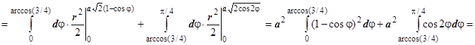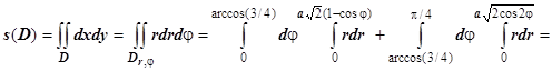 Решение. Построить эти кривые можно только в полярных координатах; первое уравнение приводится к виду , это - лемниската Бернулли; второе - к виду , это - кардиоида. Решая уравнение , находим, что точка их пересечения лежит на луче . D состоит из двух лунок одинаковой площади; вычислим площадь верхней. При эта лунка ограничена кардиоидой; при - лемнискатой, поэтому