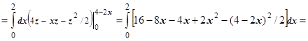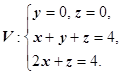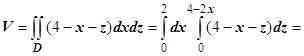 Решение. Тело изображено на рисунке справа. Перебором возможностей убеждаемся, что проще всего описать это тело, если отправляться от его проекции на ось Oxz: Область D - треугольник, ограниченный прямыми , поэтому