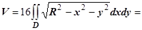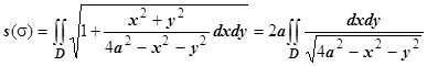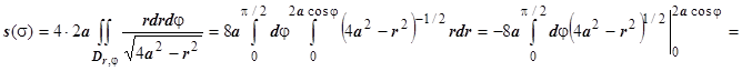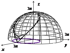 Решение. На рисунке изображён верхний из этих лепестков. Уравнение поверхности вычисляем производные и . Область D - сдвинутый на а единиц по оси Ох круг, поэтому вычисляем в полярных координатах, учитывая симметрию поверхности относительно плоскостей Оху и Охz: .