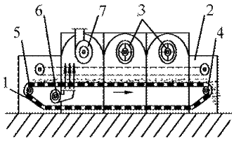 1 - бесконечная (конвейерная) лента; 2 - камера; 3-циркуляционный вентилятор; 4, 5 - звездочки; 6, 7 - вентиляторы. Рисунок 2 - Ленточная сушилка.