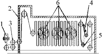 1 - питатель; 2 - бесконечная сетчатая лента; 3 - валки; 4 - молоток; 5 - разгрузочный шнек; 6 - вентиляторы. Рисунок 3.- Петлевая сушилка.
