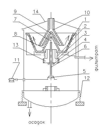 Вибрационная выгрузка осадка имеет ряд преимуществ: при регламентированном времени пребывания осадка в роторе обеспечивается отсутствие измельчения осадка, снижается износ сит, улучшается фильтрация из-за разрыхления осадка при вибротранспортировке. Основными недостатками являются сложность конструкции, пониженная надежность вследствие тяжелых условий работы амортизаторов. Таким образом, ротор, вращаясь, одновременно совершает осевые вибрации. Исходная суспензия поступает в ротор через зазор между внутренним конусом 9 и наружным конусом 10, что дает возможность равномерно распределить ее по всей окружности ротора. При этом внутренний конус защищает головку ротора от ударов кусков материала. Со дна ротора материал движется вдоль фильтрующей стенки центробежной силой. Отфуговываемая жидкость по трубе 13 выводится из центрифуги. Центрифуга закрыта кожухом 14 и имеет фундаментные амортизаторы 12. Осадок выбрасывается через верхний слой ротора и падает в днище кожуха.