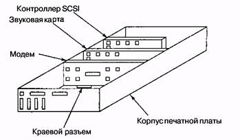 Рис. 5.3 Обычный современный персональный компьютер с шиной PCI и шиной ISA. Модем и звуковая карта — устройства ISA; SCSI-контроллер — устройство PCI Шины — это группа проводников, соединяющих различные устройства. Шины можно разделить на группы в соответствии с выполняемыми функциями. Они могут быть внутренними по отношению к процессору и служить для передачи данных в АЛУ и из АЛУ, а могут быть внешними по отношению к процессору и связывать процессор с памятью или устройствами ввода-вывода. Каждый тип шины обладает определенными свойствами, и к каждому из них предъявляются определенные требования. В этом и следующих разделах мы сосредоточимся на шинах, которые связывают центральный процессор с памятью и устройствами ввода-вывода. В следующей главе мы подробно рассмотрим внутренние шины процессора. Первые персональные компьютеры имели одну внешнюю шину, которая называлась системной шиной. Она состояла из нескольких медных проводов (от 50 до 100), которые встраивались в материнскую плату. На материнской плате находились разъемы на одинаковых расстояниях друг от друга для микросхем памяти и устройств ввода-вывода. Современные персональные компьютеры обычно содержат специальную шину между центральным процессором и памятью и по крайней мере еще одну шину для устройств ввода-вывода.