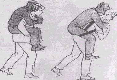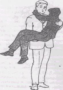 Транспортировка пораженных вручную может производиться одни или несколькими спасателями. 1). Транспортировка пострадавшего одним человеком: Переноска пострадавшего одним человеком возможна следующими способами (рис. 19.1. – 19.5.). При этом нужно учитывать свои физические возможности, вес пострадавшего и характер травмы. Переноска пострадавшего одним человеком на спине (рис. 19.2.3.) и на спине с помощью лямки (рис. 19.2.4.). Этот способ наименее утомителен для переносящего пострадавшего. Такие способы транспортировки могут быть применены при травмах нижних конечностей (стопа, голень) или бессознательном состоянии пострадавшего (отравление, удушье, сотрясение головного мозга и т.д.), но полностью исключены при переломах позвоночника, костей таза, бедра.