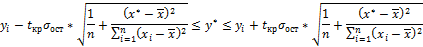 Интервальный прогноз Поэтому его сопровождают значением средней ошибки прогноза и доверительным интервалом прогноза с требуемой доверительной вероятностью. Под ошибкой понимается разность между его истинным значением и значением полученным по модели регрессии. Модуль этой разности будем называть предельной ошибкой. Предельную ошибку определяют как произведение среднего на коэффициент статистики Стьюдента Вставка