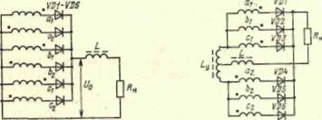 Шестифазная однотактная схема выпрямления (рис. 2.9,а) состоит из двух трехфазных вторичных обмоток а,, Ь{, с, и аг, Ьг, с2, ЭДС в которых находятся в противофазе. Первичная обмотка трансформатора должна быть соединена в треугольник, так как при соединении ее в звезду возникает вынужденное намагничивание магнитопровода трансформатора. В этой схеме каждая фаза вторичной обмотки трансформатора и каждый вентиль работают в течение 1/6 части периода, так что период первой гармоники переменной составляющей выпрямленного напряжения в 6 раз меньше периода изменения тока питающей сети. Достоинством этой схемы выпрямления является малая амплитуда пульсации выпрямленного напряжения при достаточно высокой ее частоте. Основным недостатком однотактной шестифазной схемы является плохое использование трансформатора, что приводит к существенному увеличению его габаритной мощности. Повышает использование трансформатора и вентилей схема (рис. 2.9,6), состоящая из двух трехфазных схем выпрямления, соединенных параллельно. Каждая фаза вторичной обмотки трансформатора и каждый вентиль работают в течение 1/3 части периода, но частота первой гармоники пульсации напряжения и ее амплитуда на выходе выпрямителя соответствуют шестифазной схеме выпрямления. В этой схеме выпрямления габаритная мощность трансформатора значительно меньше, а использование вентилей лучше, чем в однотактной шестифазной схеме выпрямления, но суммарная масса и габаритные размеры двух дросселей L1 и L2 больше, чем у одного дросселя в шестифазной схеме. Шестифазная схема с уравнительным реактором (схема Кюблера) представляет собой два однотактных трехфазных выпрямителя (рис. 2.9,в), включенных на параллельную работу через уравнительный реактор Ly, к средней точке которого подключен дроссель L, определяющий индуктивный характер нагрузки. При изменениях токов в полуобмотках уравнительного реактора в них индуцируются ЭДС, направленные так, что ток в нагрузку протекает от двух фаз различных трехфазных обмоток одновременно, т. е. эти фазы работают параллельно и напряжение на выходе выпрямителя равно полусумме ЭДС этих фаз, а частота и амплитуда пульсации напряжения соответствуют шестифазной схеме выпрямления. По использованию вентилей и трансформатора эта схема подобна шестифазной схеме с двумя дросселями на выходе. Основным достоинством схемы с уравнительным реактором является возможность получения сравнительно высокого КПД выпрямителя при низких выходных напряжениях. Еще одним примером шестифазной схемы выпрямления является кольцевая схема (рис. 2.9,г). В этой схеме имеются две трехфазные вторичные обмотки. В момент, когда напряжение фазы а, имеет наибольшее положительное значение, а фаза Ьг — наиболее отрицательное, ток будет протекать через фазу При больших мощностях для улучшения массогабаритных характеристик сглаживающих фильтров желательно увеличить число фаз выпрямления, что уменьшит амплитуду пульсации и повысит ее частоту. Для образования многофазных комбинированных схем выпрямления в качестве основной схемы может использоваться трехфазная мостовая схема выпрямления (схема Ларионова). При нескольких трехфазных вторичных обмотках, ЭДС которых сдвинуты по фазе на 30, 20, 15, 10° и так далее, и при таком же количестве трехфазных выпрямительных мостов можно п