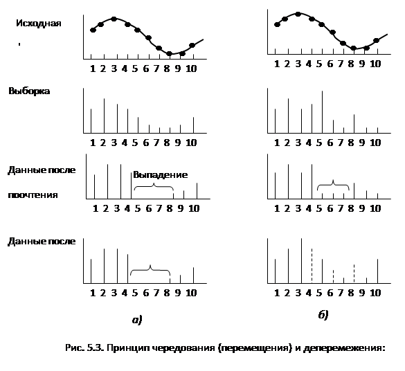 Выше уже было отмечено, что в процессе кодирования записываемого аудиосигнала цифровая аудиоинформация подвергается чередованию для того, чтобы избежать многопозиционных ошибок в кадре данных в процессе воспроизведения и, по возможности, избежать сильного влияния выпадений сигнала на качество звучания. Чередование основано на том, что аналоговые сигналы являются непрерывными сигналами и обычно без резких скачков. Амплитуда сигнала первой выборки не отличается от амплитуды второй выборки. Амплитуда в течение третьей выборки не сильно отличается от второй выборки, и т.д. Если величина второй выборки потеряна, но величина первой и третьей выборок известна хорошо, то приближением и интерполяцией можно легко вычислить вторую выборку.
