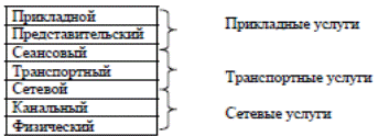 Классификация протоколов Протокол - это набор правил и технических процедур, регулирующих порядок выполнения некоторой связи между компьютерами в компьютерной сети. Протоколы работают на разных уровнях модели OSI. Каждый протокол имеет определенное назначение, решает конкретные задачи и характеризуется такими показателями, как сложность, быстродействие, качество решения и надежность.Один протокол может решать задачи нескольких смежных уровней модели OSI. Все протоколы можно разделить на три группы, в зависимости от услуг, которые они предоставляют смежным уровням или прикладным процессам семиуровневой модели OSI (рисунок 57): - прикладные услуги, - транспортные услуги, - сетевые услуги.
