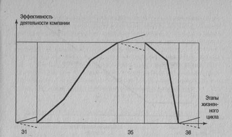 где Rj — потенциал системы на j-ом (1, 2,... 8) этапе жизненного цикла. Rij — потенциал системы в i-й области (экономика, техника, политика, финансы) на j-ом этапе. С помощью этой формулы можно рассчитать потенциал системы на каждом этапе жизненного цикла. Как упоминалось ранее, основу потенциала компании составляют материальные и нематериальные ресурсы. Величина Rmax является величиной субъективной и зависит от представлений руководителей об устойчивости компании. Rmax выражается, прежде всего, в запасах и резервах компании, существенное увеличение которых порождает проблемы их хранения и обслуживания. Развитие компании, ее продукции описывается кривой жизненного цикла. Она включает восемь (в форме шляпы) взаимосвязанных этапов (рис. 1): нечувствительность (Э1), внедрение (Э2), рост (ЭЗ), зрелость (Э4), насыщение (Э5), спад (Э6), крах (Э7) и ликвидация или утилизация (Э8).