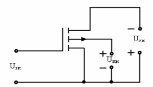 Рис. 4.5 Соответственно сечение канала начинает сужаться в направлении к стоку. При напряжении на стоке равном напряжению насыщения UСН разность потенциалов между затвором и поверхностью полупроводника становится равной нулю у стока. Толщина канала у стока становится равной нулю. МДП-транзистор переходит в режим отсечки канала. При напряжении UСИ>UСН точка отсечки сдвигается к истоку и происходит укорочение канала на DL (рис. 4.13). На участке DL обедненный слой выходит на поверхность полупроводника. После отсечки канала ток стока перестает зависеть от потенциала стока. Эта область ВАХ называется областью насыщения тока стока. На острие канала, в точке его перекрытия концентрируется электрическое поле, напряженность которого становится выше критической и наступает режим насыщения скорости дрейфа электронов, инжектированных из острия канала в обедненный слой. Ток равен: jn=еmnnEKP, так как vДР=mnEКР=const n=const, то и jn=const.
