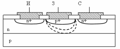 n+ - слой образует «верхний» затвор, эпитаксиальный n- - слой «нижний» затвор, часто их соединяют вместе.