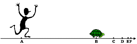 Ахіллес ніколи не наздожене черепахи. Він не може її наздогнати. Уявімо, що черепаха попереду Ахіллеса. Вона повзе, а він біжить – у тому ж напрямку. Він біжить дуже швидко, а вона повзе дуже повільно. Тим не менше, як доводив Зенон, він не може її наздогнати. Чому? Щоб наздогнати черепаху, Ахіллесу треба пробігти ту відстань, яка розділяє його й черепаху, – але поки він це зробить, черепаха проповзе якусь відстань і буде усе ще попереду. Тож щоб наздогнати черепаху, Ахіллесу треба пробігти ще й цю відстань, – але поки він це зробить, черепаха проповзе якусь відстань і буде усе ще попереду. І так далі до нескінченності. (Припустимо, в даний момент Ахіллес знаходиться у точці А, а черепаха – у точці B. Ахіллесу треба спочатку добігти до точки B. Але поки він до неї добіжить, черепаха трохи проповзе, і буде вже в точці C. Поки Ахіллес добіжить до точки С, черепаха проповзе якусь відстань, і буде вже у точці D. Ахіллесу треба добігти до цієї точки, але поки він це зробить, черепаха ще трохи проповзе, – і так до нескінченності.) Отже, Ахіллес ніколи не наздожене черепаху.