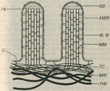 Рис. 3-17. Схема ультраструктурной организации микроворсинки. АМФ – актиновые микрофиламенты, АВ – аморфное вещество (апикальной части микроворсинки), Ф, В – фимбрин и виллин (белки, образующие поперечные сшивки в пучке АМФ), мм – молекулы минимиозина (прикрепляющие пучок АМФ к плазмолемме микроворсинки), ТС – терминальная сеть АМФ, С – спектриновые мостики (прикрепляют ТС к плазмолемме), МФ – миозиновые филаменты, ПФ – промежуточные филаменты, ГК – гликокаликс.