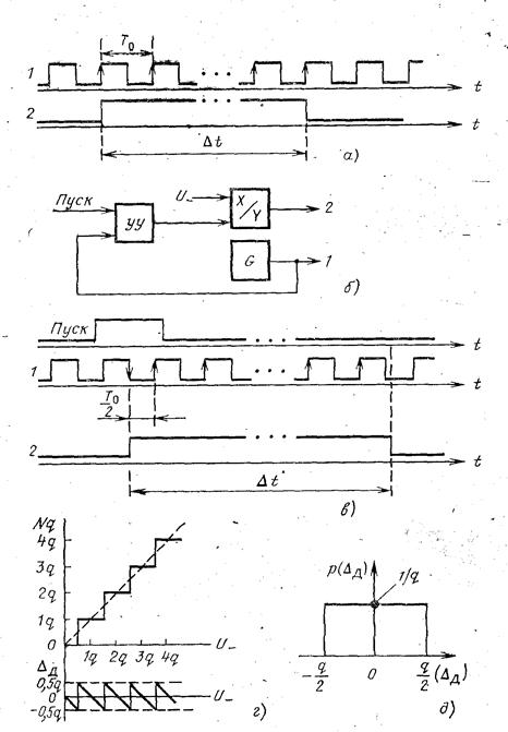 Относительная погрешность измерений характеризует качество измерений: чем она меньше, тем качество выше. Погрешность метода измерений (методическая) – это составляющая погрешности измерения, происходящая от несовершенства метода измерений. К ним относятся составляющие погрешностей, вызываемые влиянием средства измерения на измеряемую цепь. Например, погрешность измерения ЭДС источника вольтметром с конечным входным сопротивлением. При измерении другим методом, например, нулевым, эту погрешность можно исключить. Часто к методическим относят и погрешности, связанные с принятой моделью реального объекта измерения. Инструментальная погрешность измерения - это составляющая погрешности измерения, зависящая от погрешностей применяемых средств измерения. В соответствии с характером зависимости погрешностей средств измерений от значения измеряемой величины различает аддитивные и мультипликативные погрешности. Аддитивная погрешность не зависит от значения входной величины средства измерения Она может быть вызвана смещением стрелки прибора, действием термоЭДС и наводок в контурах сравнения, дрейфом нуля электронных усилителей. Мультипликативная погрешность зависит от значения входной величины х и вызывается изменением чувствительности S средства измерения. Итак, общая статическая погрешность ЦИП содержит погрешность дискретности и инструментальные погрешности. Рассмотрим погрешность дискретности. Возьмем времяимпульсный метод измерения. Обратим внимание на два обстоятельства: а) сигналы 1 и 2 (рисунок 3.1а) несинхронизированы, т. е. их взаиморасположение во времена произвольно; б) сигнал 1 неизменен, а длительность импульса в сигнале 2 может принимать бесчисленное множество значений — это непрерывная величина (H). На рисунке 3.1а) показано наихудшее в некотором смысле взаиморасположение сигналов 1 и 2 и соотношение между