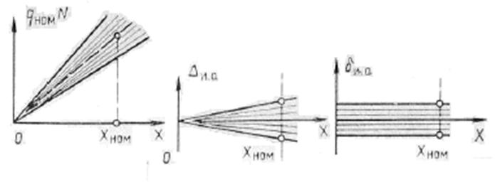 Отметим, что в дальнейшем под погрешность дискретности будет пониматься для общего случая, т. е. К инструментальным погрешностям относятся аддитивная, мультипликативная и погрешность нелинейности. Инструментальные погрешности зависят от погрешностей применяемых средств. Неточность градуировки, конструктивные несовершенства, изменения характеристик прибора в процессе эксплуатации и т. д. являются причинами основных погрешностей инструмента измерения. Зависимости абсолютной и относительной инструментальных погрешностей от измеряемой величины показаны на рисунках 3.2-3.4.