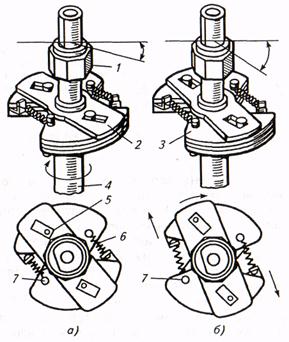 Рис. 2.5. Центробежный регулятор: а - положение грузиков на холостом ходу двигателя; б - положение грузиков при максимальной частоте вращения вала двигателя. Вследствие этого контакты размыкаются раньше. При уменьшении частоты вращения грузики с помощью возвратных пружин возвращаются в исходное положение. Пружины имеют различную жесткость, что позволяет получить требуемый закон изменения угла опережения зажигания при изменении частоты вращения двигателя. На рис. 2.6 приведены типовые характеристики центробежных регуляторов, представляющие собой зависимость угла опережения зажигания по валику распределителя θр от частоты его вращения. При достижении определенной частоты вращения грузики полностью расходятся и автомат перестает работать. Характеристика становится горизонтальной.