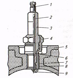 Рис. 2.8. Свеча зажигания открытого типа. Современная свеча открытого исполнения (рис. 2.8) состоит, как правило, из металлического корпуса 4 с резьбой для ввертывания в головку цилиндра 5, бокового электрода 9, изолятора 3 с контактной головкой 2 и центральным электродом 8. Между коническими посадочными местами изолятора и корпуса кладется уплотнительная теплоотводящая шайба 7. Между головкой блока цилиндров и свечой устанавливается уплотнительное кольцо 6. Для обеспечения контакта между свечой и высоковольтным проводом иногда применяют гайку 1. Сердечник, включающий в себя изолятор с контактной головкой и центральным электродом, соединяется с корпусом при помощи термоосадки корпуса. При этом буртик корпуса завальцовывается за плечико изолятора, корпус нагревается и спрессовывается с усилием до 30 кН. Корпус нагревают методом пропускания электрического тока силой до 9000 А через термоосадочную канавку. Эту же операцию производят при помощи тока высокой частоты. Центральный электрод и контактную головку закрепляют а изоляторе с помощью токопроводящего стеклосплава. Этот способ обеспечивает герметичность свечи в процессе эксплуатации. Центральный электрод устанавливают в канале изолятора сверху, а на него - контактную головку. Изолятор вместе с этими деталями нагревают до температуры 800 - 900°С, и контактная головка запрессовывается в расплавившуюся таблетку стеклогерметика. Боковой электрод прикрепляют к корпусу методом контактной сварки. Для специальных целей, в случае необходимости наиболее полного подавления радиопомех или обеспечения работы свечи в условиях сильного загрязнения, применяют экранированные и герметизированные свечи. Иногда в цепь центрального электрода встраивают подавительное сопротивление 500 - 10 000 Ом. Материал центрального электрода должен обладать высокой коррозионной и эрозионной стойкостью, жаростойкостью и хорошей теплопроводностью. Центральные электроды изготавливают из хромотитановой стали 13Х25Т, а у некоторых типов свечей - из нихрома Х20Н80, боковые электроды - из никель-марганцевого сплава (например, НМц-5). Корпус свечи и контактную головку изготавливают из конструкционных сталей.