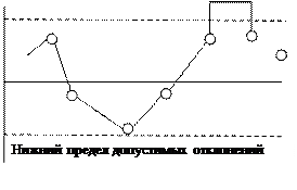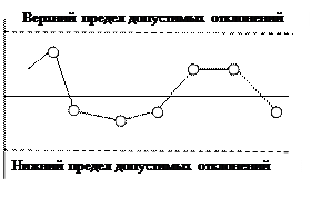 4. по расположению точек «X» на контрольной карте относительно контрольных границ принимается решение о годности изделия или браке при приемочном контроле и о необходимости вмешательства в технологический процесс при текущем контроле.