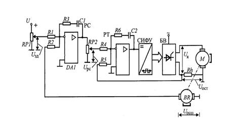 Рис. 3.32 Регулятор тока в схеме выполнен на операционном усилителе DA 2 в виде ПИ-регулятора. Использование ПИ-регулятора позволяет получить максимальное быстродействие токового контура. На вход РТ через резисторы R 4 и R 5 поступает сигнал с выхода РС – Uрс и с выхода датчика тока (шунт Rh) – Uост. Регулятор скорости выполнен на операционном усилителе DA 1 в виде ПИ-регулятора. Использование ПИ-регулятора в скоростном контуре придает астатизм системе (см. п. 3.2). В астатической системе при использовании идеального регулятора статическая ошибка в поддержании скорости сводится к нулю. На вход РС через R 1 поступает сигнал U зд от задатчика скорости (потенциометр RP 1) и через R 2 – сигнал отрицательной обратной связи Uoc w по скорости, снимаемый с тахогенератора. Для настройки значения тока отсечки в схеме предусмотрен потенциометр RP 2. Максимальное значение напряжения на выходе РС определяется насыщением усилителя. На вход РТ подается часть выходного напряжения РС, снимаемого с делителя RP 2. Перемещая движок RP 2, например, вниз, можно уменьшать максимальное значение сигнала U рс. Этот сигнал является задающим для внутреннего токового контура. А его максимальное значение определяет максимальный ток якоря – ток отсечки.