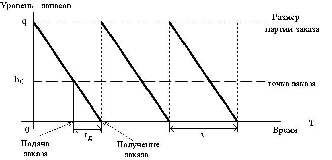 Классическая модель управления запасами с допущением дефицита Классическая модель управления запасами без дефицита Управление запасами (УЗ) – установление периодичности поставок, их объемов, регулярности и наилучших сроков выполнения. Рассматривают несколько основных систем регулирования запасов: · система с фиксированным размером заказа [1, с.123]; · система с фиксированной периодичностью заказа [1, с.124]; · система с двумя фиксированными уровнями или (s-S)-система [1, с.124]; · системы оптимального управления запасами [1, с.125] и т.д. Разработаны различные модели управления запасами: · детерминированные модели; · стохастические модели; · статические модели; · динамические модели. Простейшей моделью УЗ является классическая модель системы управления запасами наиболее экономичного размера партии (модель Уилсона). Это детерминированная модель, имеющая аналитическое решение. Она основана на выборе фиксированного размера заказываемой партии, которая минимизирует общие расходы на оформление заказа, доставку и хранение товара. Предполагается также, что выполнены следующие условия: · уровень запаса убывает равномерно от q до 0; · время поставки заказа является известной и постоянной величиной; · каждый заказ поставляется в виде одной партии; затраты s на оформление заказа и доставку товара не зависят от объема партии; · ежедневная стоимость h хранения единицы товара постоянна; · отсутствие запаса (дефицит) является недопустимым. Циклы изменения уровня запаса в модели Уилсона графически представлены на рис.18.1. Максимальное количество продукции, которая находится в запасе, совпадает с размером заказа q.