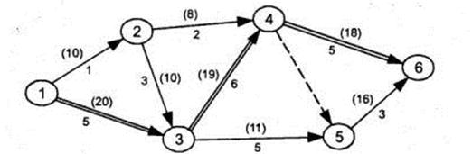 Рис.20.1. Схема сетевого графика Начало стрелки показывает, с какого события данная работа начинается, а конец стрелки показывает, в каком событии она заканчивается. Работы имеют временные оценки, которые проставляются на стрелках. Событие считается свершившимся тогда, когда будет закончена самая длительная из всех входящих в него работ. Требуемые для выполнения работы размеры ресурсов указываются на стрелках в скобках. Путем в графе называется такая упорядоченная последовательность дуг (стрелок), что конец любой дуги (стрелки), кроме последней, совпадает с началом следующей дуги. Максимальный по продолжительности полный путь в сети называется критическим; работы, лежащие на этом пути, также называются критическими (на графике они отражаются двойными стрелками). Выявление критического пути позволяет установить работы (операции), определяющие ход выполнения проекта. Критические работы в ходе проектирования должны выполняться строго по графику. Именно длительность критического пути определяет наименьшую общую продолжительность работ по проекту в целом. При анализе сетевого графика ставятся следующие задачи: 1. Отыскание минимального времени выполнения всего проекта (критического времени). 2. Отыскание тех операций, которые существенно влияют на критическое время; их совокупность образует так называемый критический путь.