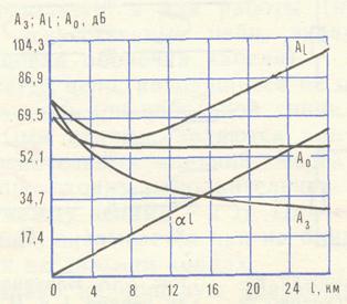 Fig. 3.10 - Dependence of the transient attenuations Al, A0 and protectability АЗ from length of line.