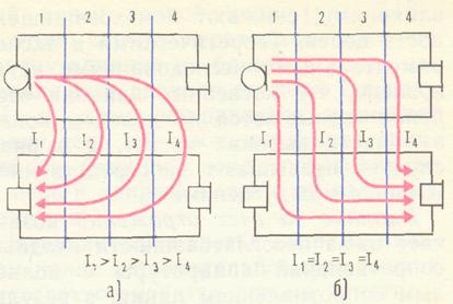 Рис. 3.11. Cложение токов влияния с различных участков линии: а) на ближнем конце, б) на дальнем конце. Fig. 3.11 – The addition of the influence currents from the different subcircuit of line: а) on the near end; б) on the far end. a30 Защищённость АЗ для воздушных линий уменьшается по закону Переходное затухание на дальнем конце Al (см. рис. 3.10) изменяется по линейному закону Из рисунка 3.11 б следует, что с увеличением длины линии увеличивается число участков влияния на дальний конец. Однако токи помех уменьшаются, так как удлиняется путь прохождения этих токов к дальнему концу и возрастает собственное затухание цепи a.l. The protectability АЗ for air lines decreases by law The transient attenuationon the far end Al (look at Fig. 3.11) changes by linear law From Fig. 3.11 b follows that with increase the length of lines increases the numbers of subcircuit which influence to the far end. However, nose currents decrease, since the way of the passing these current to far end increases and increases attenuation of circuits a.l.