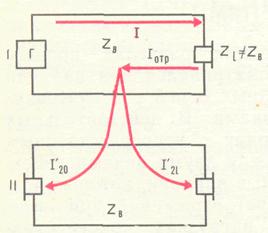 Рис. 3.12. Влияние между цепями за счёт несогласованности сопротивлений нагрузки (Zl) и сопротивления линии (Zв) Fig. 3.12- Influences between circuits due to of unmatched of loading resistance (Zl) and line wave impedance (Zв) Как следует из рисунка, в приёмник первой цепи поступает лишь некоторая доля электромагнитной энергии, часть энергии отражается и распространяется обратно к началу цепи. Из-за электромагнитной связи между цепями эта энергия частично переходит во вторую цепь (цепь II) и проявляется на ближнем и дальнем концах цепи в виде тока помех. Таким образом, кроме тока прямого влияния появляется дополнительное влияние за счёт отражения энергии при несогласованности нагрузки. Аналогичный процесс происходит также и при несогласованности сопротивления аппаратуры и линии в начале и конце второй цепи. Дополнительное влияние за счёт несогласованности нагрузок выражается через коэффициент отражения p: