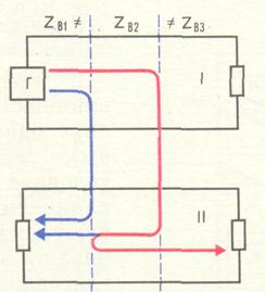 Influence due to reflections arises up from unmatched of input resistances of apparatus with the line wave impendence. As a result there are the reflected waves, which increase of the natural attenuation of circuits (a), appearance of the transmission distortions and appearance of the additional influence between circuits. On a Fig. 3.12 is shown the nature of appearance of additional influences between circuits due to unmatched of loading resistance and line wave impedance ( As follows from the Figure, some part of electromagnetic energy to come in the receiver of first circuit, the part of energy is reflected and propagated to the beginning of circuit. On account of the electromagnetic coupling between circuits, this energy partly passes to the second circuit (circuit II) and shows up on the near and far ends of circuit as the noise current. Thus, besides the direct influence current, additional influence appears due to the energy reflection when load is unmatched. The similar process also takes place when apparatus and line resistance are unmatched at the near and ends of the second circuit. Additional influence due to unmatched load is expressed through the reflection coefficient p: