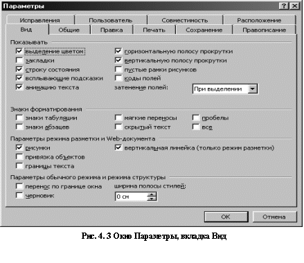 Более простые настройки можно выполнить по контекстному меню, вызываемому нажатием правой клавиши мыши на любой панели инструментов. Помимо возможности изменять количество панелей, присутствующих в окне, или количество элементов внутри панелей, можно панели инструментов перемещать по экрану в наиболее удобное место. Чтобы переместить панель, необходимо подвести указатель мыши к левой границе панели и подождать, пока курсор примет вид маркера перемещения (четырех направленной стрелки). После этого, удерживая нажатой левую кнопку мыши, перетащить панель в другое место. Команда Сервис►Параметры► вкладка Вид позволит установить или убратьполосы прокрутки, строку состояния, всплывающие подсказки и др.(рис. 4.3)