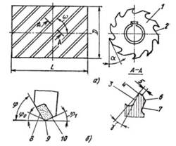 Рис. 6.3. Элементы и геометрия фрезы: а – цилиндрическая фреза; б – зуб торцовой фрезы; 1 – корпус, 2 – зуб, 3 – передняя поверхность зуба, 4 – режущее лезвие, 5 – ленточка, 6 – задняя поверхность, 7 – спинка зуба, 8 – главное режущее лезвие, 9 – переходное режущее лезвие, 10 – вспомогательное режущее лезвие Зуб фрезы имеет следующие элементы: переднюю поверхность 3, заднюю поверхность 6, спинку зуба 7, ленточку 5 и режущее лезвие 4. У цилиндрических фрез различают углы: передний угол g, измеряемый в плоскости А–А, перпендикулярной к режущему лезвию; главный задний угол a, измеряемый в плоскости, перпендикулярной к оси фрезы; угол наклона зубьев w. Передний угол g облегчает образование и сход стружки. Главный задний угол a обеспечивает благоприятные условия перемещения задней поверхности зуба относительно поверхности резания и уменьшает трение на этих поверхностях. Угол наклона зубьев w обеспечивает более спокойные условия резания по сравнению с прямым зубом и придает направление сходящей стружке.